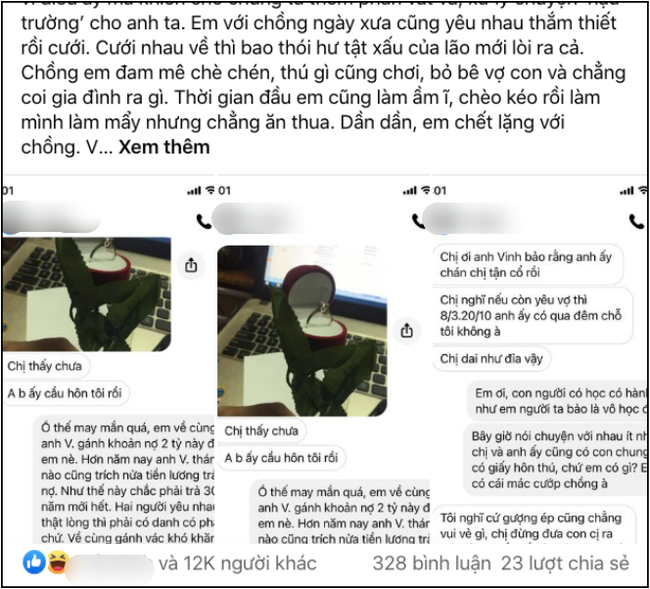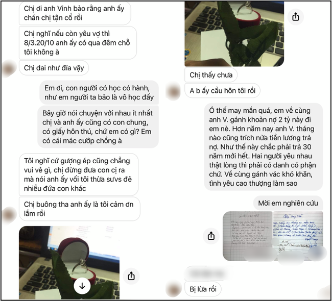 Đi kèm chính là những tin nhắn của cô vợ: “Ồ thế may mắn quá, em về cùng anh V. gánh khoản nợ 2 tỷ này đi em nè. Hơn năm nay anh V. tháng nào cũng trích nửa tiền lương trả nợ. Như thế này chắc phải trả 30 năm mới hết. Hai người yêu nhau thật lòng thì phải có danh có phận chứ. Về cùng gánh vác khó khăn, tình yêu cao thượng làm sao”.
