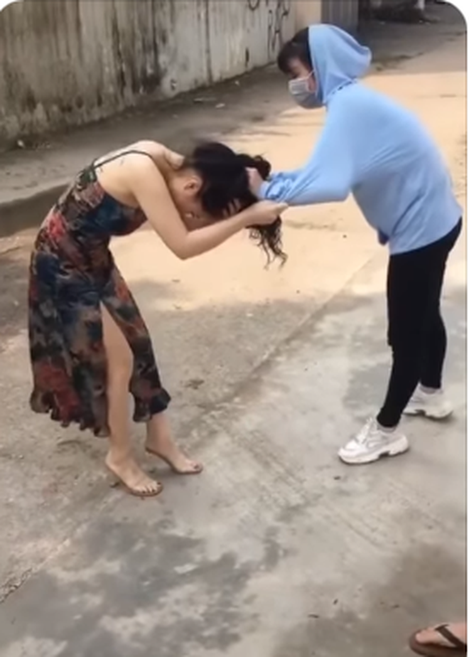Vừa túm tóc kéo ra đường, người phụ nữ mặc áo chống nắng được cho là vợ vừa nói lớn, "Mày sang nhà tao làm gì?Mày thích đăng lên facebook nữa không? Thích đi bay à?, Thích rủ chồng người khác đi bay à?, Tao cạo tóc mày nhé. Mày cặp với chồng tao, tưởng tao hiền, tưởng tao không biết à". Vừa nói, người vợ vừa túm tóc lôi ra đường đồng thời dùng chân đạp vào người bồ nhí của chồng.