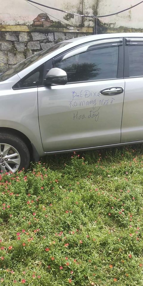 Bởi vậy, phía trên cửa ô tô đã bị viết một dòng chữ "dằn mặt" rất gay gắt: "Bác đi xe không mang não à, hoa đấy".