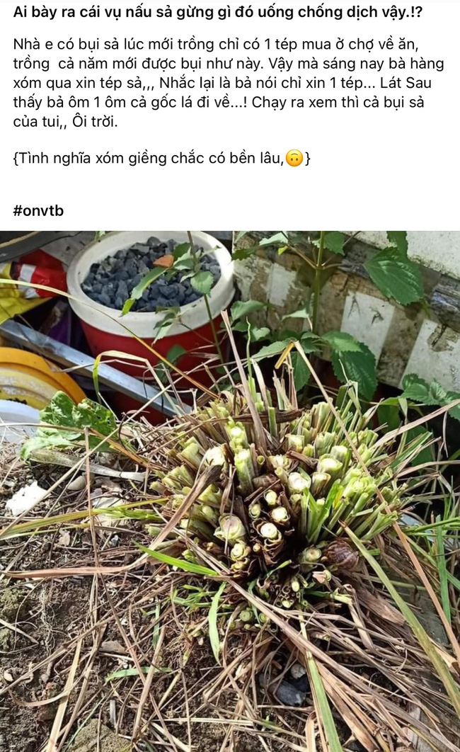 Khổ chủ kể đã mất cả năm để trồng được bụi sả từ khi nó chỉ là một tép sả nhỏ. Tuy nhiên, người hàng xóm lại vì câu chuyện tin đồn uống sả gừng trị được dịch bệnh, "xuống tay" vặt trụi bụi sả nhà cô. Trong khi trước đó, lúc hỏi xin thì người này chỉ bảo lấy một tép để dùng.