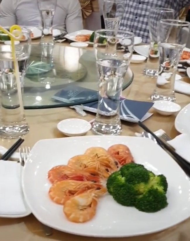 Ngỡ đâu sẽ có thịt bò sốt vang, thịt gà, xôi, hàu, salad hoa quả, cá... nhưng thực tế lại trái ngược hoàn toàn. Trên bàn tiệc có tổng cộng 10 người (tính cả nhân vật quay video), nhưng mỗi khách lại chỉ được 1 chiếc đĩa đựng 6 con tôm và ít bông cải xanh. Những vị khách khác cũng đang cười đùa tỏ vẻ hào hứng rút điện thoại ghi lại hình ảnh trên mâm cỗ cưới.