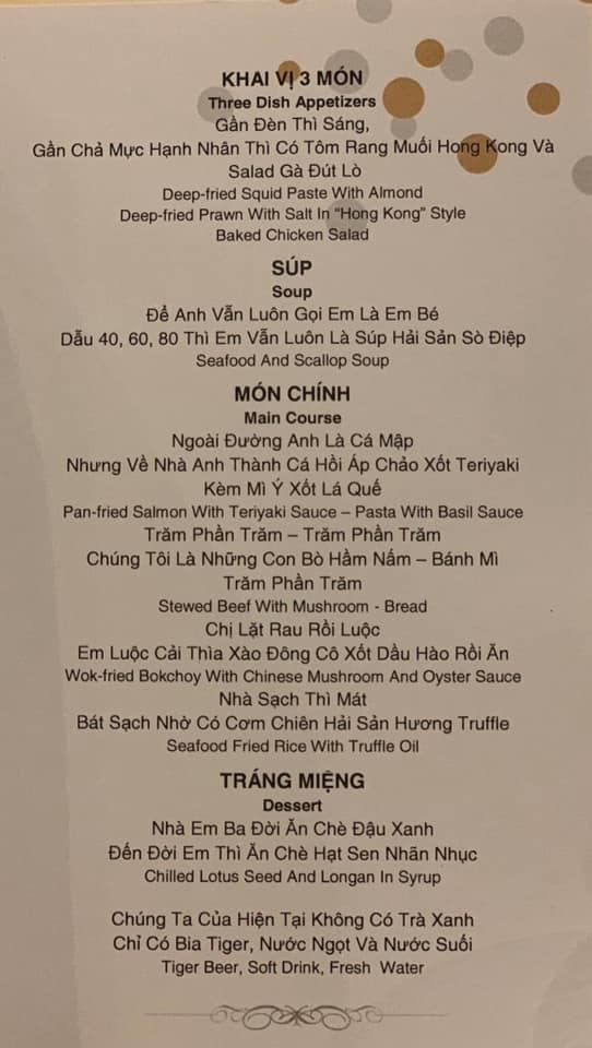 Vừa vào thực đơn, chúng ta có ngay câu “Gần đèn thì sáng /Gần chả mực hạnh nhân thì có tôm rang muối Hong Kong và salad gà đút lò” rồi tiếp đến là bê thẳng nguyên câu hát của AMEE vào trong phần giới thiệu món súp: “Để anh vẫn luôn gọi em là em bé/ Dẫu 40, 60, 80 vẫn luôn là súp hải sản sò điệp”.
