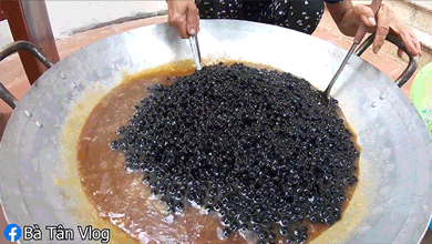 Trân châu mà bà Tân sử dụng để làm cốc sữa tươi trân châu đường đen này là loại đóng gói, còn đường đen được chế biến từ đường hoa mai. Vẫn chiếc "nồi 100" quen thuộc, bà Tân dùng để ninh trân châu cho chín. Công đoạn ninh trân châu này đã "suýt" thất bại vì bà Tân để quên thìa và phải chạy đi lấy rồi mới quay lại đảo trân châu được.