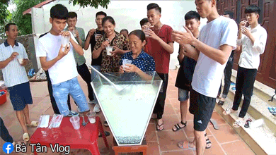 Sau khi làm xong sẽ đến công đoạn "giải quyết" cốc sữa tươi trân châu đường đen khổng lồ này. Và tất nhiên, một mình bà Tân thì không thể uống hết được. Cũng như mọi lần, chỉ cần hô một câu "các cháu ơi" là các cháu của bà Tân kéo ra lũ lượt để cùng nhau thưởng thức sản phẩm khổng lồ mà bà Tân vừa làm xong.