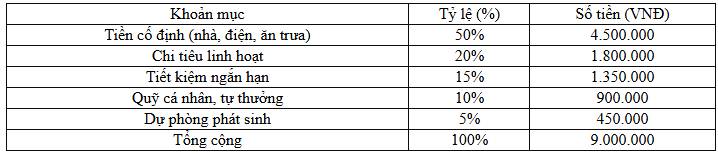 Bảng chia thu nhập hàng tháng từ lương 9 triệu đồng