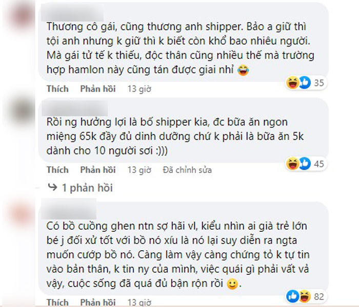 Sau khi chia sẻ câu chuyện, cư dân mạng đã tỏ ra thương cảm cho cô nàng tốt bụng. Đây cũng coi như bài học cho mọi người, nên cẩn trọng trước khi muốn tặng đồ ăn cho shipper thì hãy chọn người nào trông đứng tuổi chút để đỡ rước phiền vào người.