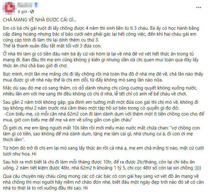 Trong một bài đăng mới đây trên mạng xã hội, cô gái cho biết gia đình có hai chị em và người chị lớn của cô thì đã về nhà chồng. Dù sở hữu bằng cấp đàng hoàng nhưng vì sanh liền tù tì 3 nhóc nên cô chị này buộc phải gác lại hết sự nghiệp để toàn tâm chăm lo cho con.