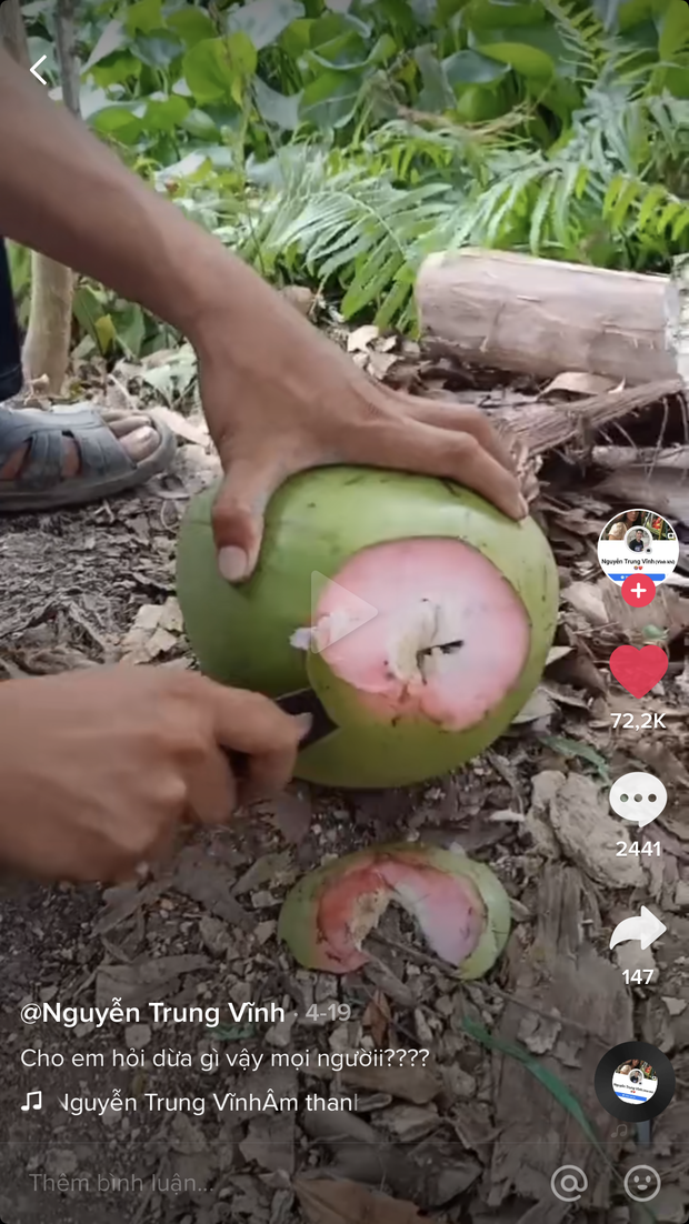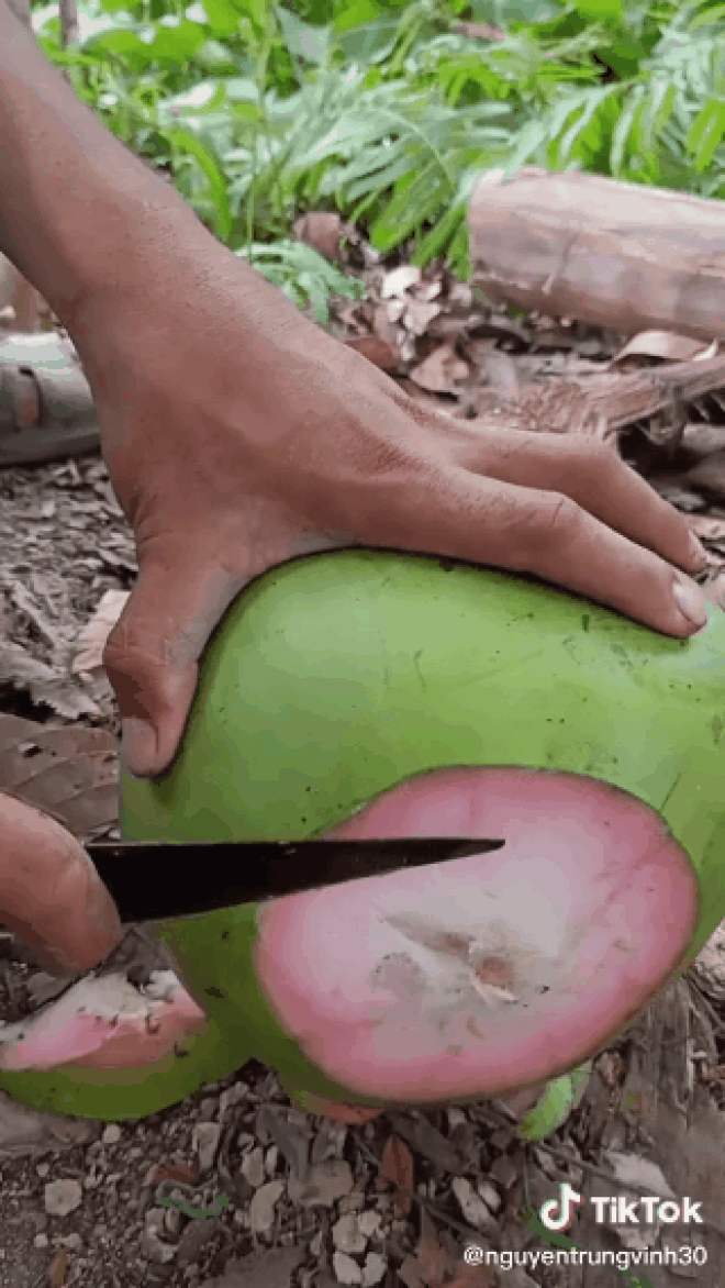 Thế nên phần màu hồng độc đáo của trái dừa này ngay lập tức khiến người dùng TikTok bàn tán xôn xao. Có người cho rằng đây là giống dừa dâu, người lại khẳng định nó là dừa sen.