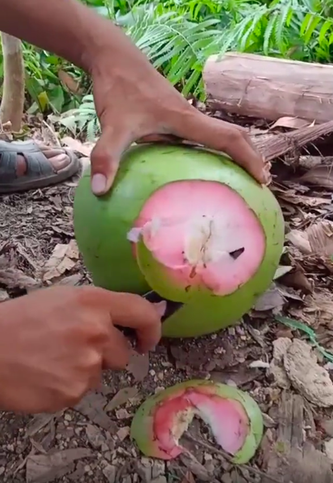 Trong video, người đàn ông dùng dao gọt vỏ quả dừa mà mình vừa hái xuống trong vườn. Vừa quay, anh ta vừa nói "rõ ràng, màu hồng rõ ràng nha" như để chứng minh cho những người đứng xung quanh biết nhà mình có giống dừa đặc biệt đến vậy.