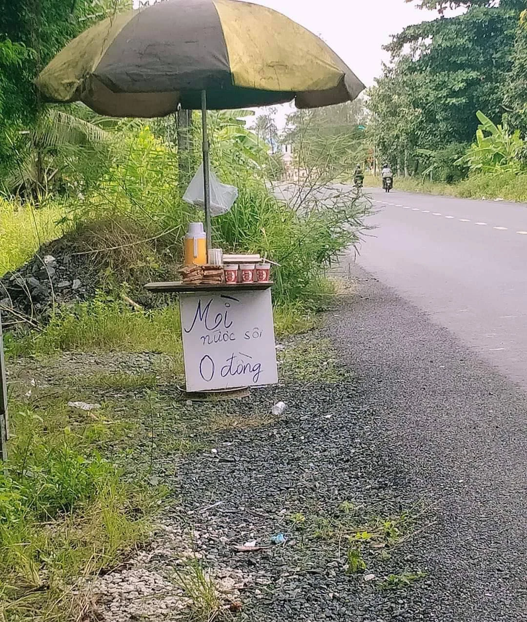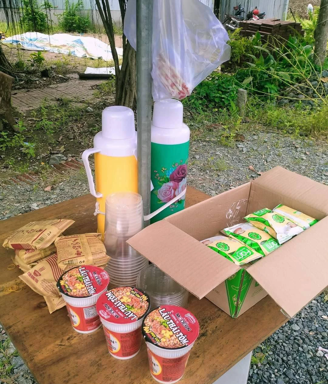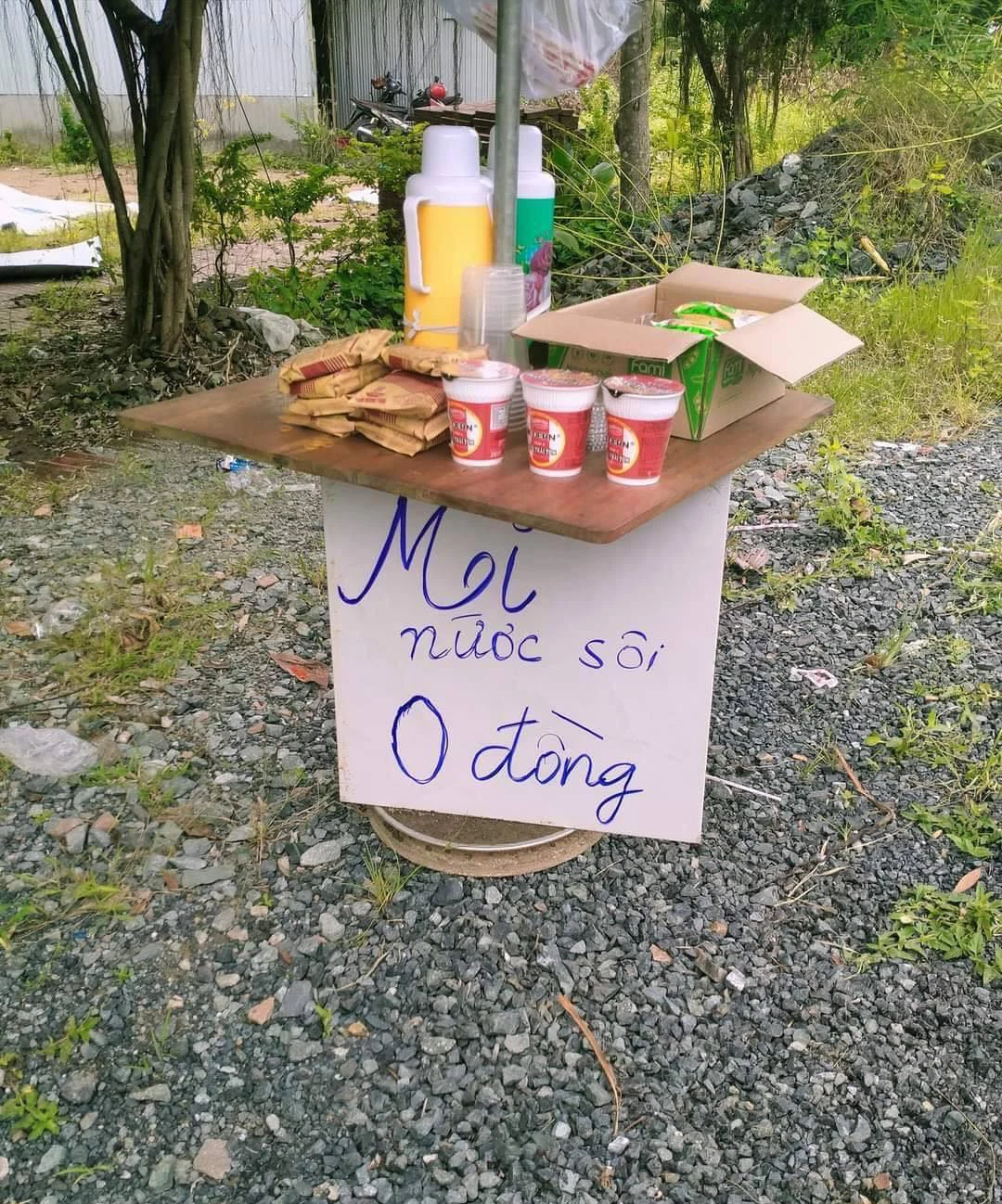 Được biết, trạm "nước sôi, mì gói 0 đồng" này được đặt trên Quảng lộ Phụng Hiệp đường dẫn về tỉnh Cà Mau. Ngoài mì gói, sữa, người ta còn thật chu đáo chuẩn bị ly ăn mì, nước sôi để trong bình thuỷ cho người đi đường tự pha mì ăn tránh đói.