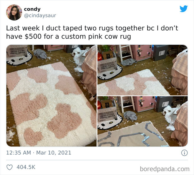 "Tuần trước tôi đã dùng băng keo dán 2 tấm thảm lại với nhau vì tôi không có 500 USD (11,5 triệu đồng) để mua tấm thảm bò sữa hồng".