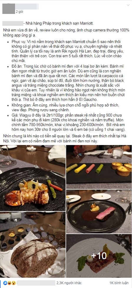 Bill nhà em hôm nay hơn 30 triệu cho 8 người lớn và 6 em bé (có uống 1 chai vang). Nhìn chung là khi nào có tiền sẽ quay lại. Steak ở đây em thích nhất tại Hà Nội. Với lại em có niềm đam mê với bánh mì đen nơi này".