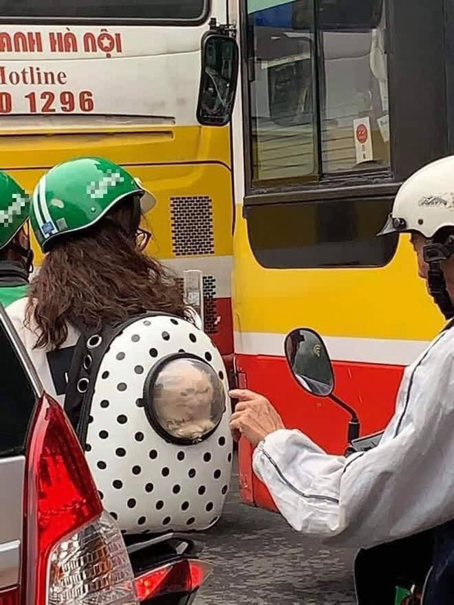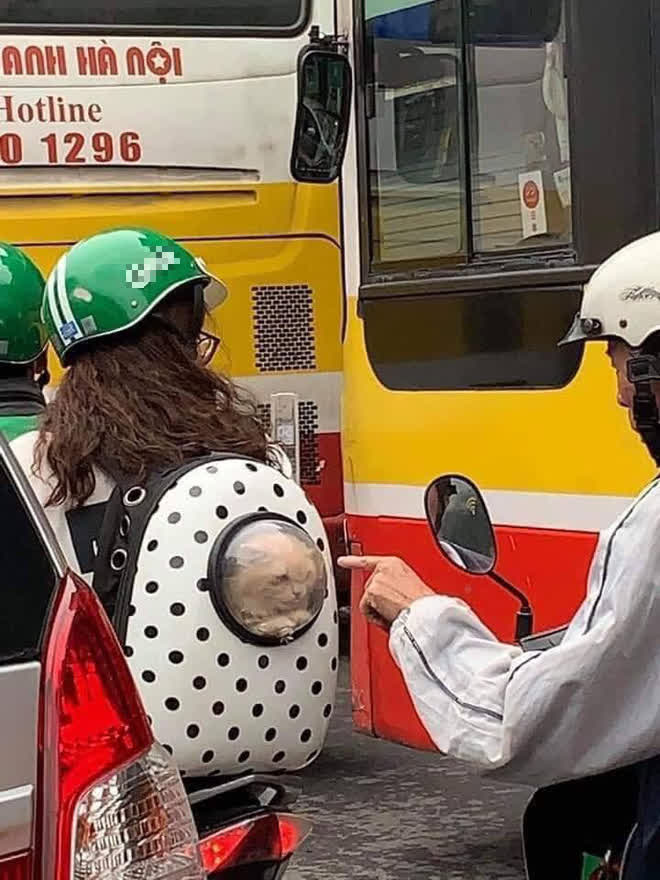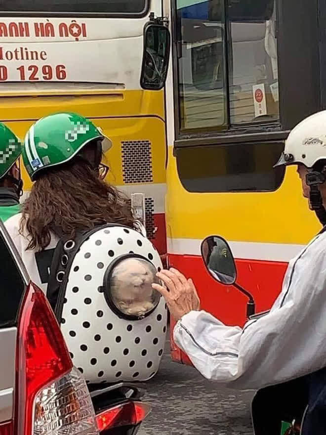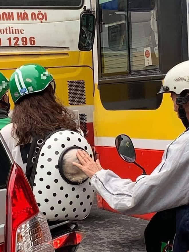Tấm hình chụp lại cảnh tượng xảy đến trong lúc chờ đèn đỏ gây chú ý. Một cụ già dừng xe máy ở phía sau và thoải mái nghịch ngợm, đùa nghịch với con mèo nhỏ ở trong ba lô của cô gái ngồi trước. Có lẽ, cô cũng chẳng biết rằng ở phía sau, có một ông cụ đang nghịch, trêu chọc chú mèo của mình. Cụ già hết giơ tay lên chào lại vỗ vỗ vào ba lô. Nhìn còn mèo có vẻ hơi quạu và khó tính, cụ cũng chỉ một ngón tay như nhắc nhở: "Phải ngoan nha".