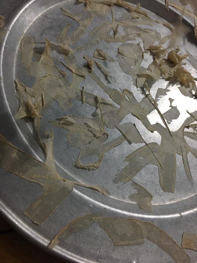 P/s: Cái này em phơi xong rồi nhé, đây là thành phẩm, chứ lúc thái xong nó không dính mâm thế này đâu ạ".