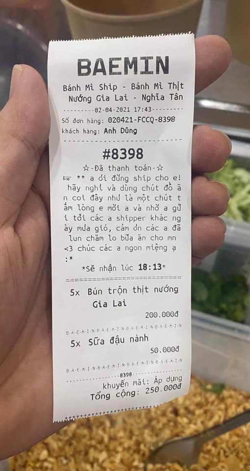 "Nhà mình bán bún cũng lâu lắm rồi, nhưng hôm qua trời Hà Nội mưa phùn với nồm nồm khách đi ăn ít mà chủ yếu đặt món qua app là chính, đang chuẩn bị đồ thì có đơn nổ 5 bún với 5 nước đậu. Đọc qua lời nhắn đơ người một lúc vì bất ngờ. Anh shipper phải gọi lại khách xác nhận mới tin là thật. Lần đầu tiên mình gặp đơn hàng như thế luôn, anh shipper còn nói: "Trời mưa đi ship cả ngày mà giờ cảm thấy ấm lòng quên cả mệt". Bạn khách chắc từng làm shipper hay sao còn biết giờ mà các anh thường ăn để đặt hay sao í".