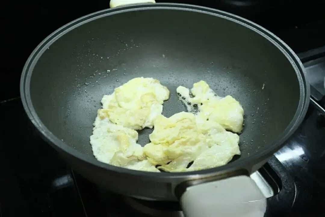 Bước 2: Tiếp theo đặt chảo lên bếp đun nóng và cho một chút dầu ăn vào. Sau đó bạn đổ trứng vào chiên cho đến khi chín. Tiếp theo bạn cho các loại nguyên liệu gồm đậu nành, váng đậu, nấm hương, mộc nhĩ vào xào trên lửa lớn (có thể thêm chút gừng băm nhỏ). Đảo đều và nêm nước tương, dầu hào, lượng muối thích hợp, tinh chất cốt gà. Thêm một ít nước sôi (phải là nước sôi, nếu dùng nước lạnh sẽ khiến hương vị của món ăn kém ngon - mùi trứng tanh).
