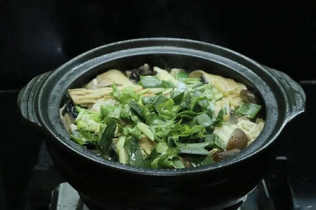 Bước 3: Sau đó bạn rắc tỏi băm, lá tỏi tây thái nhỏ vào, đậy nắp nồi lại, ninh trên lửa nhỏ cho đến khi các nguyên liệu chín. Cuối cùng nêm nếm lại cho vừa khẩu vị của gia đình để món ăn thêm ngon. Món này rất hợp với cơm, đặc biệt là phần nước dùng trộn với cơm rất ngon.