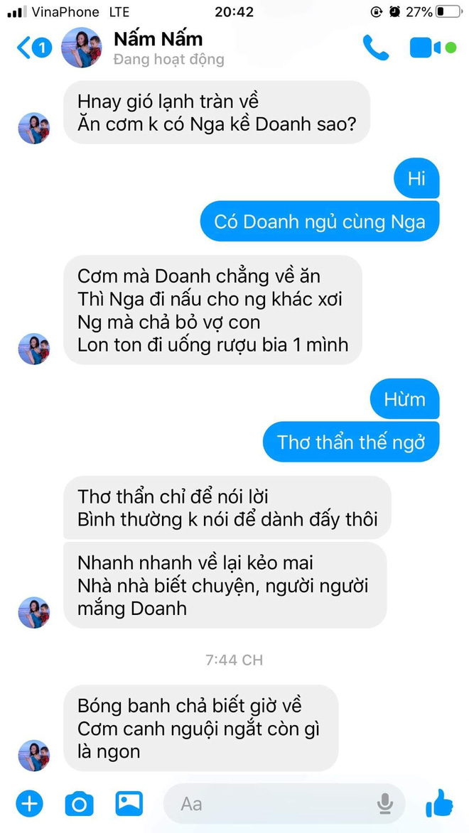 Vợ anh Doanh là chị Nguyễn Nga, 29 tuổi, hiện đang là giáo viên Tiểu học. Không chỉ khi chồng đi nhậu mà bất kể lúc nào chồng về nhà muộn, chị Nga đều nhắn tin hỏi giờ về.