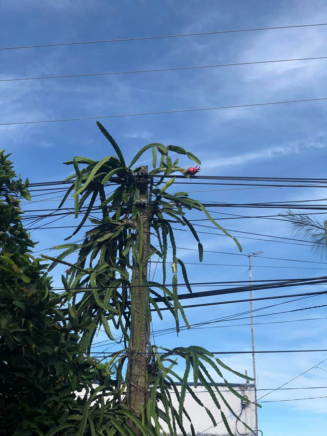 Mà không chỉ có ở trên cao thôi đâu, trái thanh long cứng đầu còn nhất định chui vào một đám loằng ngoằng toàn dây điện nữa. Nhiều cư dân mạng sau khi xem ảnh thì cũng đưa ra cao kiến, hoặc là thuê cần cẩu đến bẻ thanh long, còn không thì cũng phải chờ hôm nào cắt điện rồi thì mới trèo lên hái được. Rõ là khổ lắm cơ.