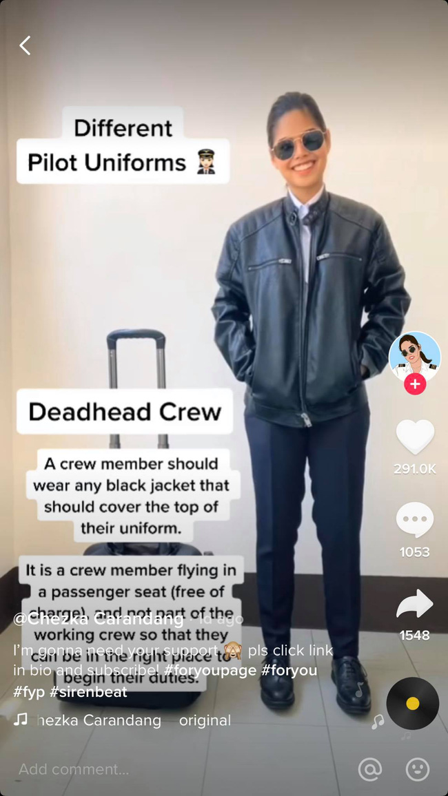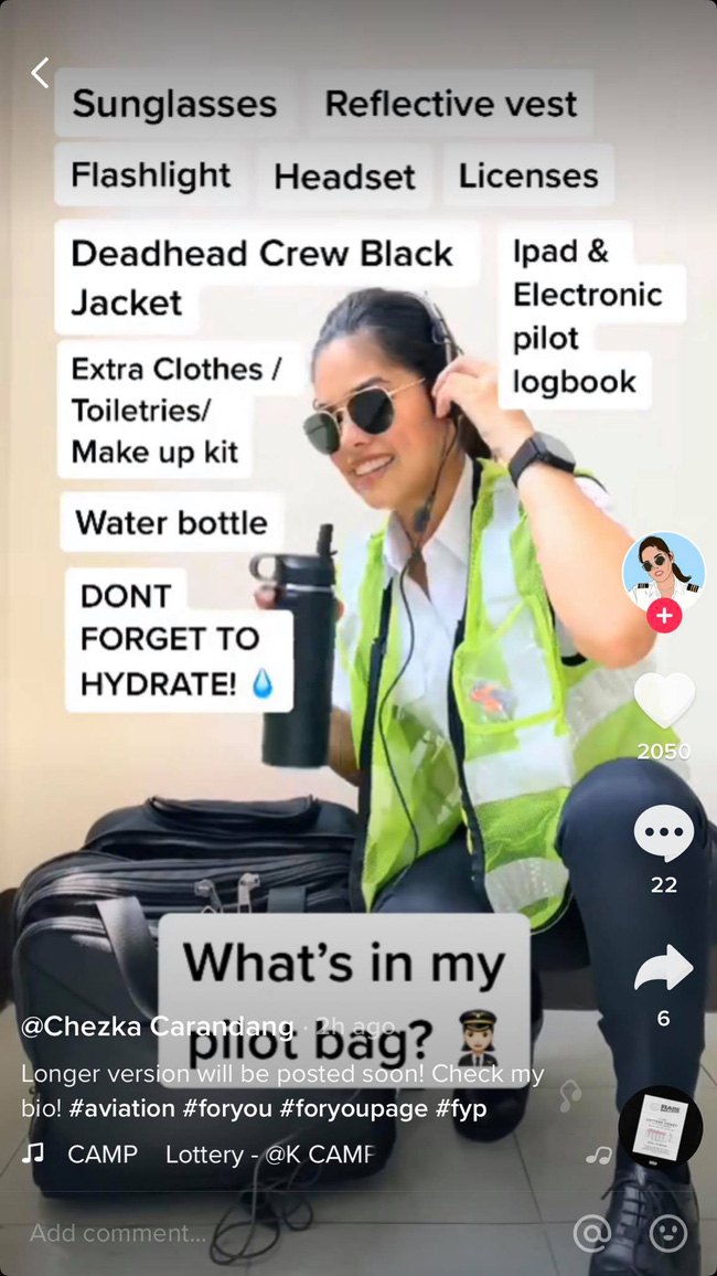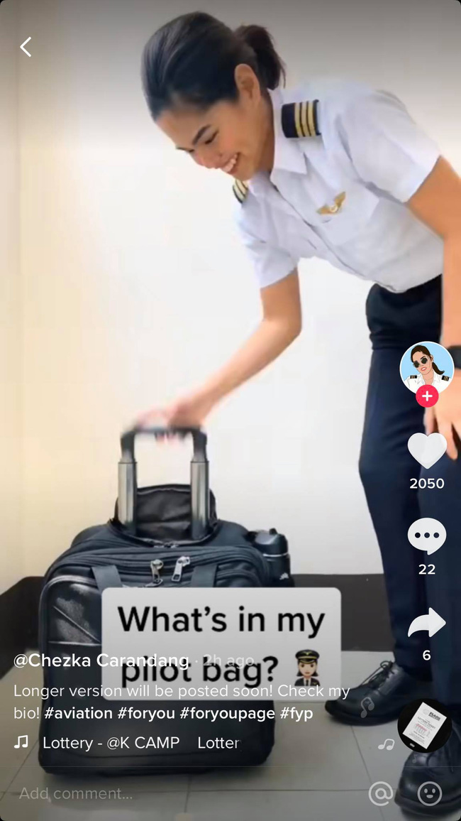 Vậy thì, có ai tò mò xem liệu khi đi làm việc, các phi công phải trang bị những gì cho mình hay không? Hãy cùng nghe nữ cơ trưởng tên là Chezka Carandang tiết lộ qua những video của cô ấy nhé.