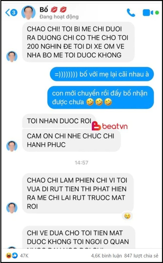 Xem ra ông bố trong câu chuyện đã cãi nhau với vợ nên đành "muối mặt" cầu cứu con gái: "Chào chị, tôi bị mẹ chị đuổi ra đường, chị có thể cho tôi xin 200 nghìn để tôi đi xe ôm về nhà bố mẹ tôi được không?".