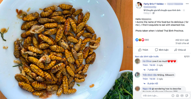 Đó là món nhộng tằm - một món đặc sản của Việt Nam. Vô tình được chiêu đãi trong một chuyến du lịch Thái Bình, anh chàng này ăn một lần mà mãi không quên được nên đã đăng bài hỏi han trong một hội nhóm người nước ngoài ở Việt Nam.