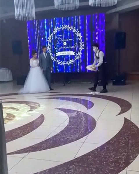 Cụ thể, một nam nhân viên bưng chiếc bánh kem tiến vào sân khấu nơi cô dâu chú rể đứng. Tuy nhiên, sau vài bước đi, anh bị mất đà khiến chiếc bánh đổ sập xuống trong sự ngỡ ngàng của quan khách. Éo le hơn, mặt anh chàng cũng bị úp trọn xuống chiếc bánh.