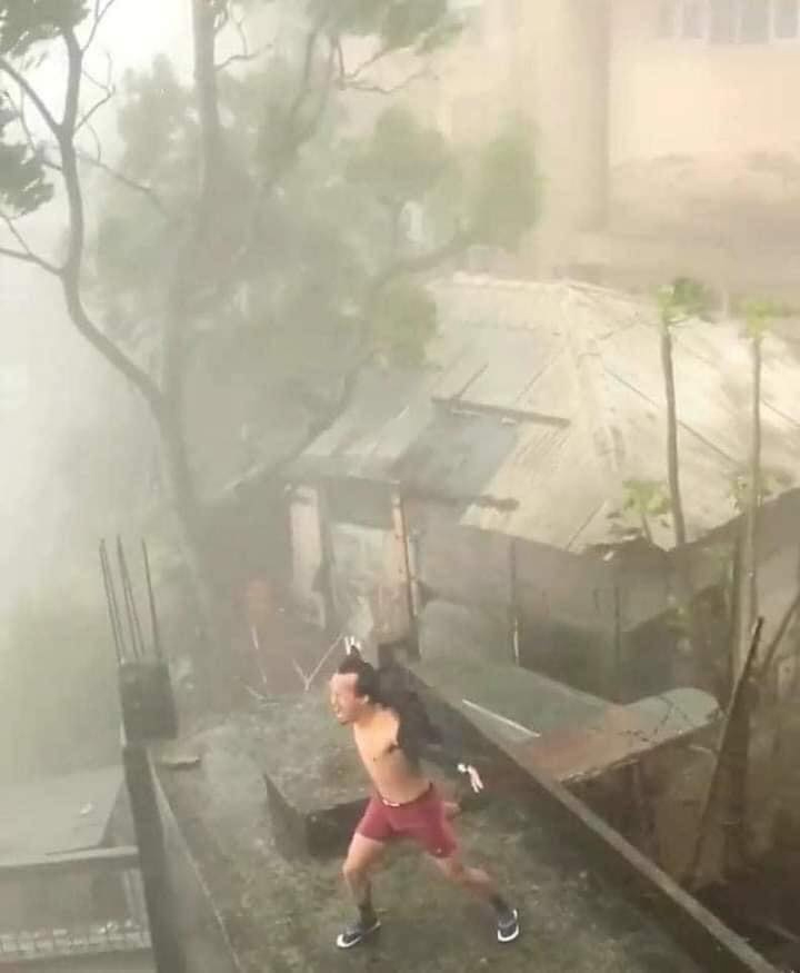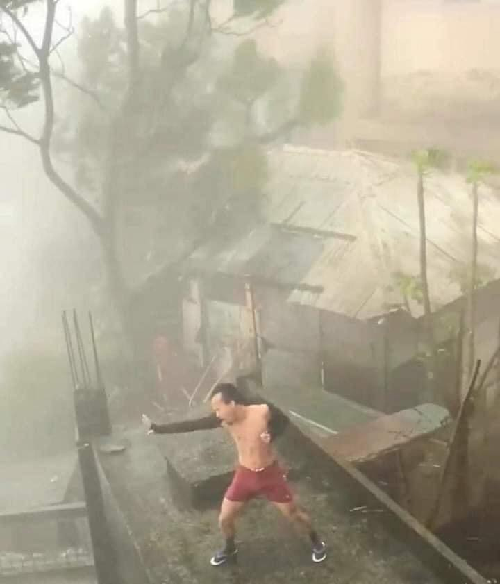 Cụ thể, không hiểu thế nào mà thay vì đi tránh bão, một người đàn ông ở Đà Nẵng mặc áo phanh ngực, ra đứng giữa trời giông gió lớn và vận nội công hệt như các cao thủ trong tiểu thuyết Kim Dung. Theo nhiều người đùa, ông đang dùng công lực 40 năm của mình để ngăn bão số 9.