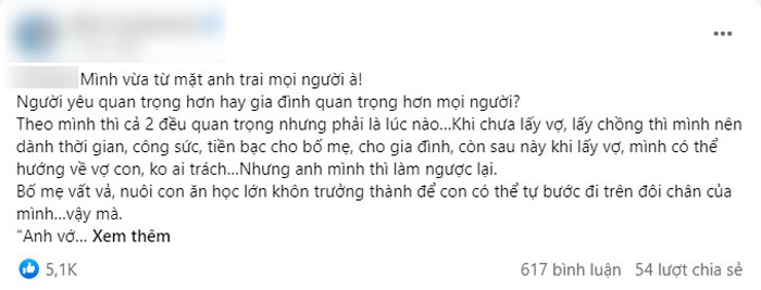 Mới đây, một cô gái khó chịu khi anh trai không quan tâm lo cho bố mẹ nhưng sẵn sàng chi tiền triệu thậm chí hơn chục triệu để mua quà tặng bạn gái: