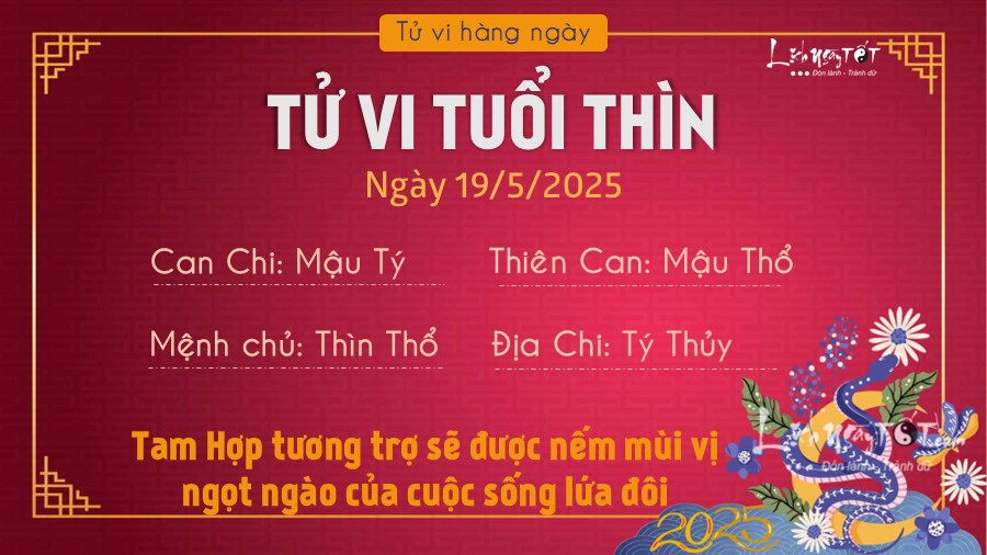 Ngày có Tam Hợp tương trợ nên tuổi Thìn sẽ được nếm mùi vị ngọt ngào của cuộc sống, nhất là khía cạnh tình cảm đang bước vào giai đoạn đẹp nhất. Ngoài ra, bản mệnh cũng biết điều tiết tâm trạng, mối quan hệ xã giao tốt.