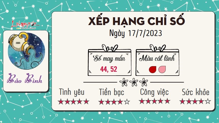 Trong ngày hôm nay, thời điểm Mặt Trăng tạo 1 góc 120 độ với sao Hải Vương, Bảo Bình có thể tạo ấn tượng tốt với mọi người nhờ tài năng và tính cách ấm áp của mình. Hãy phát huy thế mạnh trong công việc, bạn sẽ phát triển cực kì nhanh chóng đấy. Dù là người mới đi nữa, bạn cũng không cần quá ngại ngần. Bạn dành cho nửa kia tình yêu và sự quan tâm chân thành nhất. Mối quan hệ giữa hai bạn đang ngày càng bền vững theo thời gian. Những hướng đi mới trong chuyện làm ăn kinh doanh chưa giúp bạn thu về lời lãi dồi dào ngay được, song bạn hãy tin tưởng vào tương lai.