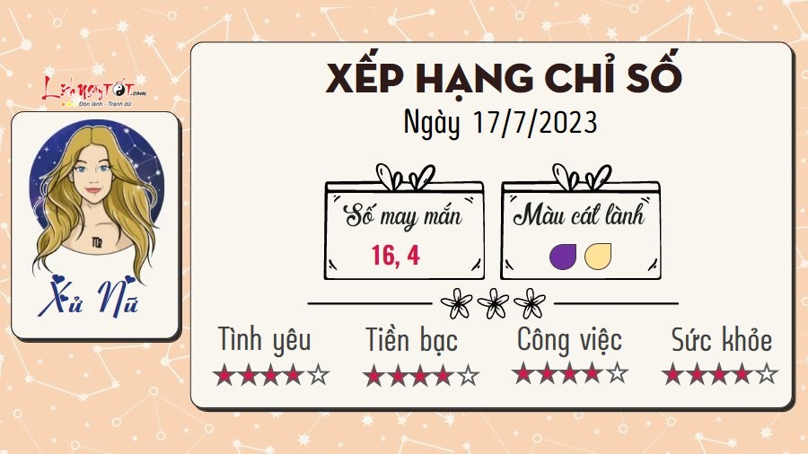 Xử Nữ luôn cảm thấy bất an trong ngày Mặt Trăng hợp thành góc 135 độ với sao Thổ như hôm nay. Bạn sợ mình trở thành người tụt hậu trong tập thể. Hãy dành thời gian học hỏi thêm kiến thức mới và tự tin hơn vào bản thân. Thực chất bạn chẳng hề thua kém bất cứ ai cả. Bạn dành nhiều sự quan tâm cho nửa kia của mình, chính vì vậy mà hai bạn ngày một hiểu nhau hơn. Mối quan hệ của hai người phát triển vô cùng bền vững. Những hướng đi cũ sẽ khiến bạn chẳng thể kiếm được khoản tiền dư dả như dự kiến. Bạn nên mạnh dạn thử sức mình trong những lĩnh vực mới mẻ hơn.
