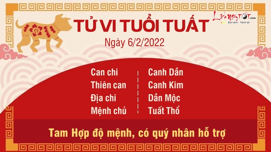 Bản mệnh có Thiên Ấn nên những người làm nghệ thuật, nghệ sĩ, y học, luật sư, tôn giáo sẽ có chút thành tích trong tuần tới. Người làm tự do thì vất vả hơn rất nhiều, bươn chải khá nhiều nhưng vẫn thấy bế tắc, nản chí. Mộc khắc Thổ khuyên Tuất nên cân bằng thời gian cho các khía cạnh trong cuộc sống, đặc biệt là tình cảm. Bạn bỏ bê gia đình quá nhiều, quá tham công tiếc việc. Hãy để người ấy và gia đình cảm nhận được rằng bạn luôn ở bên để họ có thể thoải mái dựa vào khi cần chứ không phải là bất cần. Mặt tài lộc cũng may là nhờ Tam Hợp cứu vớt lại. Tuổi này ra ngoài hay có quý nhân trợ mệnh, càng nỗ lực nhiều thì may mắn sẽ càng mỉm cười với bạn. Hôm nay vẫn có nhiều cơ hội kiếm chác nhưng không phải phụ thuộc vào thu nhập chính mà là từ các loại quà tặng, giải thưởng.
