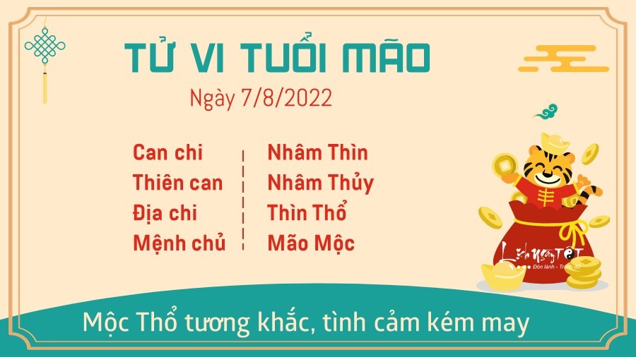 Hôm nay tuổi Mão lâm Thương Quan nên nếu ai đi làm thì phải cẩn thận ăn nói, hành động kẻo mất chức, nghỉ việc giữa chừng hoặc bị thôi học. Làm gì cũng phải suy đi tính lại cẩn thận một chút để sau này không phải hối hận, chỉ cần làm tốt việc của mình là đủ, đừng ôm việc hộ người khác. Đường tiền bạc may mắn nhờ Tam Hội cục. Tiền bạc đang theo nhau đổ về túi bản mệnh, nhất là người kinh doanh sẽ có doanh thu vượt trội. Ngoài ra nếu con giáp này có ý định mở rộng quy mô làm ăn hoặc nhập thêm hàng mới, khai trương thì cũng có sự thuận lợi nhất định. Vận trình tình cảm của Mão không tốt do Mộc Thổ tương khắc. Mão không thích tụ tập bạn bè đến nhà rồi tàn cuộc mình tự dọn. Bạn cũng không thích giao du với nhiều người vì sợ lòng người. Chỉ muốn yên phận sống bình an với gia đình, ghét ngoại giao quá nhiều.