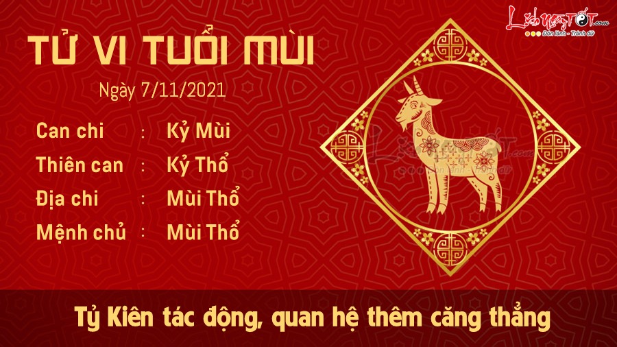 Người tuổi Mùi sẽ có một ngày cuối tuần chẳng mấy dễ chịu khi bị Tỷ Kiên tác động. Mối quan hệ giữa các thành viên trong gia đình trở nên căng thẳng vì chẳng thể đồng nhất quan điểm về các vấn đề dù là nhỏ nhất. Đây là lúc đôi bên đều cần phải bình tĩnh và học cách lắng nghe đối phương nhiều hơn. Mọi việc sẽ chỉ càng thêm phức tạp nếu cả hai tiếp tục bướng bỉnh và khăng khăng rằng bản thân luôn đúng như thế. Ngày Thổ khí quá vượng, sức khỏe của bản mệnh có thể bị ảnh hướng ít nhiều, nhất là với những người có tiền sử các bệnh về tim mạch, máu huyết. Hãy chắc rằng bạn luôn thực hiện một chế độ ăn uống và nghỉ ngơi điều độ đó.