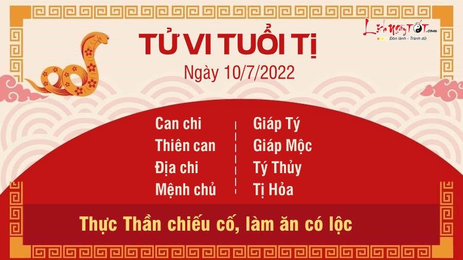Cuối tuần này sự nghiệp của tuổi Tị được Thực Thần chiếu cố nên những người làm quán ăn, mở cửa hàng thực phẩm, buôn bán đồ ăn hoặc kinh doanh tự do sẽ gặp thuận lợi. Lộc kinh doanh trong ngày này khá nhiều, càng xởi lởi thì khách càng đông đến mức ai nhìn vào cũng nóng ruột. Do cục diện Thủy khắc Hỏa nên tình yêu vừa chớm nở lại vấp phải rào cản từ phía gia đình hoặc bạn bè, bản mệnh phải tự mình cố gắng mà thôi.