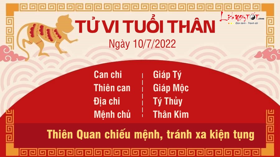 Thiên Quan chiếu mệnh cảnh báo tuổi Thân nên tránh xa kiện tụng, tranh cãi với cấp trên hay đồng nghiệp trong tuần tới. Là con giáp hiền lành dễ bị tiểu nhân hãm hại nhưng nay đường tình cảm của bản mệnh may mắn được Tam Hợp nâng đỡ nên tránh được họa tiểu nhân, quan hệ xã giao tốt đẹp hài hòa. Chuyện tiền bạc của bản mệnh may mắn thêm nhiều phần do cục diện Kim sinh Thủy. Kiếm tiền khá dễ dàng, ngay chính bạn còn thấy ngỡ ngàng vì lộc lá tự rơi vào tay mình, tài lộc nhờ vậy mà gia tăng nhanh chóng.