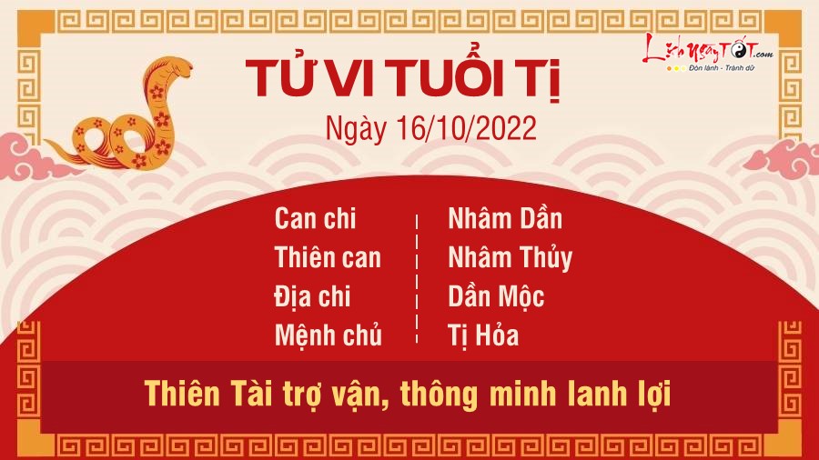 Thiên Tài trợ vận giúp tuổi Tị trở thành người lanh lợi và thông minh trong công việc. Nay có những cơ hội phát tài đang ở ngay trước mắt mà tuổi Tị không thể nào bỏ qua được. Chuyện làm ăn kinh doanh càng về cuối năm càng trở nên tốt đẹp hơn, tiền bạc không ngừng đổ về túi bạn, có điềm trúng thưởng hoặc làm ăn trúng lớn. Vận trình tình cảm tăng tiến nhờ ngũ hành Hỏa sinh Mộc.