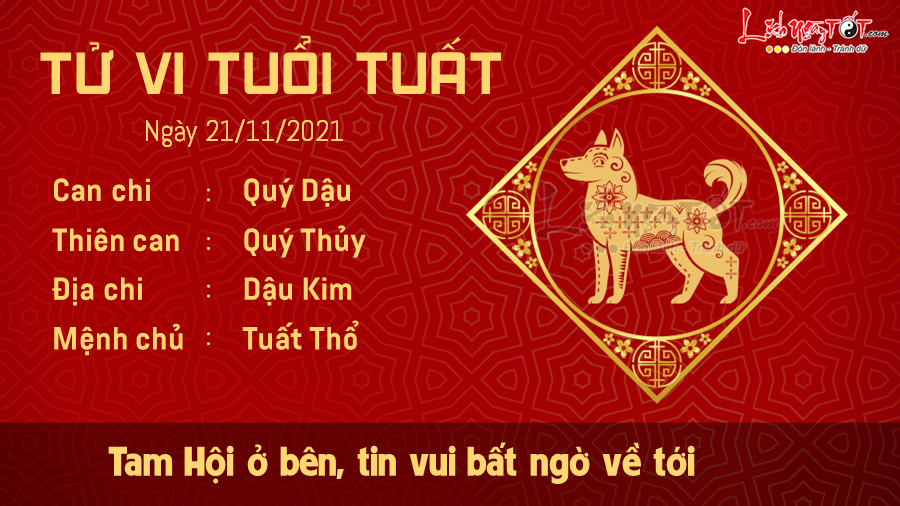 Tiếp nối tử vi ngày 20/11/2021 của 12 con giáp, người tuổi Tuất sẽ có một ngày chủ nhật thoải mái chẳng phải lo nghĩ khi được Tam Hội trợ mệnh. Mọi việc diễn ra trôi chảy đến không ngờ, bạn còn có thể đón tin vui bất ngờ trong ngày này nữa. Một dự án mà bạn tham gia bỗng đạt được thành tích cao hơn hẳn.