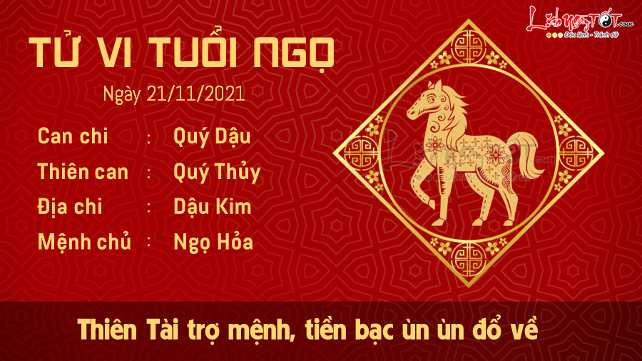 Tử vi hôm nay 21/11/2021 chỉ ra rằng, vận may tiền bạc sẽ tìm đến với người tuổi Ngọ trong ngày có Thiên Tài ghé thăm này. Cơ hội kiếm tiền bất ngờ xuất hiện, chỉ cần bạn mạnh dạn chớp lấy thì tiền sẽ ùn ùn đổ về túi không ngờ.