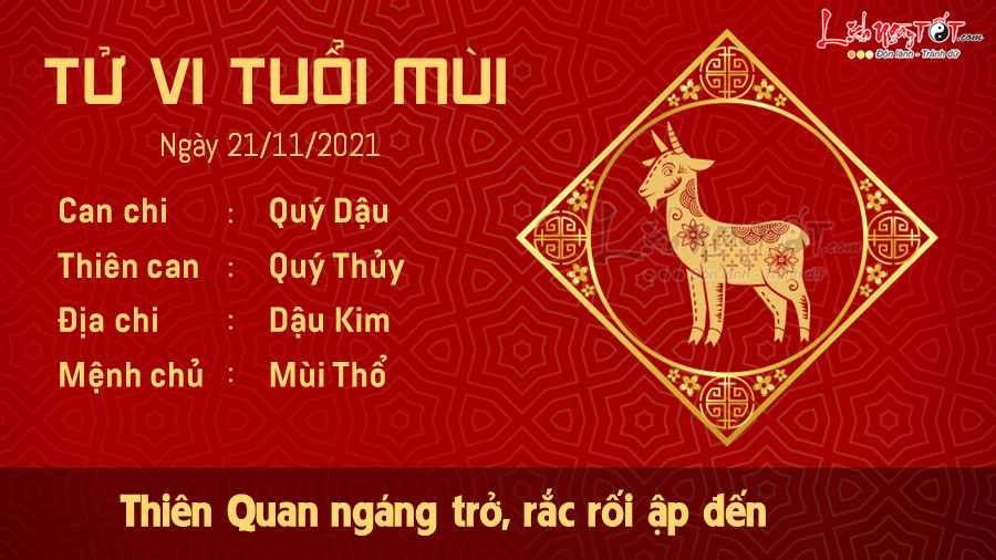 Xem bói tử vi, Thiên Quan ngáng trở, một vài rắc rối sẽ ập đến khiến cho người tuổi Mùi trở tay không kịp. Dù vậy bạn cũng đừng để bản thân mất bình tĩnh mà hành xử nóng vội. Chỉ một bước đi sai lầm có thể khiến cho công sức bạn bỏ ra bấy lâu tan thành mây khói.