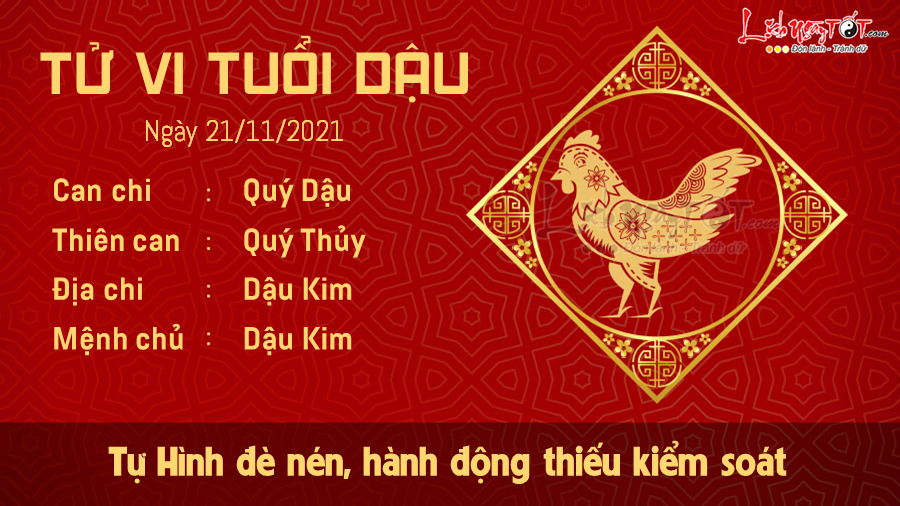 Tử vi ngày 21/11/2021 nhận thấy, chịu ảnh hưởng của cục diện Dậu Dậu Tự Hình nên tâm trạng của con giáp tuổi Dậu có phần khó chịu và buồn bực khi mọi chuyện chẳng diễn ra đúng ý mình. Những hành động thiếu kiểm soát lúc nóng giận có thể khiến có hình ảnh mà bạn gây dựng bấy lâu bị xấu đi trong mắt mọi người.