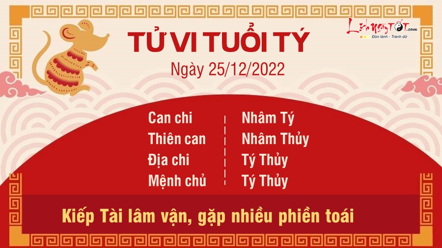 Tiếp nối tử vi hàng ngày 24/12/2022, nay công việc của Tý có nhiều phiền toái do Kiếp Tài lâm vận. Có điềm mất hàng hóa, mất tài liệu quan trọng hoặc bị tiểu nhân chơi xấu sau lưng, nên cẩn thận. Bạn phải tập trung cao độ trong công việc để không bị xảy ra sai sót đáng tiếc, việc mình thì mình làm, đừng có để ý việc của người khác.