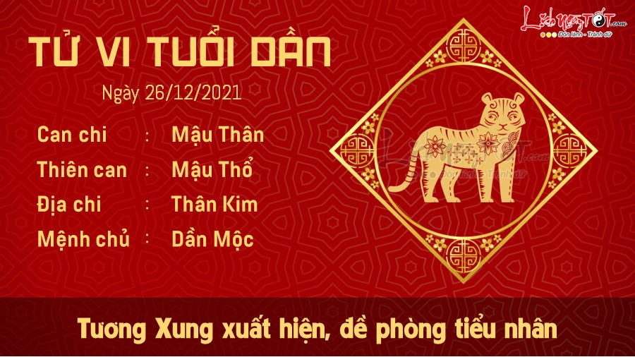 Tử vi ngày 26/12/2021 của 12 con giáp dự báo ngày mới bị ảnh hưởng bởi Tương Xung nên công việc của tuổi Dần trăm đường vất vả, bạn làm gì cũng gặp trục trặc, cố gắng nhiều nhưng chẳng được bao nhiêu. Ngoài ra tuổi này cần phải đề phòng có kẻ tiểu nhân xuất hiện hãm hại lúc nào không hay, thương trường là chiến trường, đừng tin tưởng người lạ.