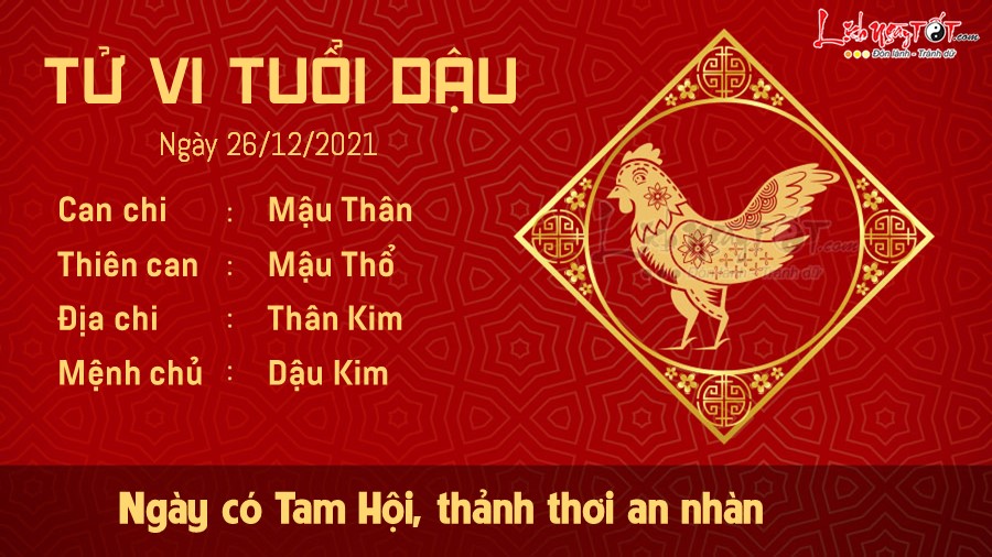 Tử vi ngày 26/12/2021 của 12 con giáp cho biết Tam Hội sẽ đem lại cho Dậu quý nhân giúp đỡ đường công danh, sự nghiệp. Bạn trẻ tuổi Dậu không nên ham chơi quá đà, hãy tận dụng thời gian rảnh rỗi để trau dồi thêm kỹ năng làm việc cho mình, bạn có tài nếu biết phát huy sẽ cực kỳ tốt.
