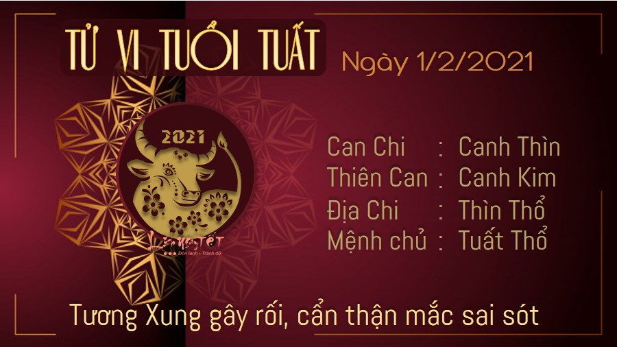 Cục diện Tương Xung khiến công việc của tuổi Tuất liên tiếp gặp trục trặc. Nếu bạn là người mắc sai sót, hãy dũng cảm đứng ra nhận trách nhiệm và tìm cách khắc phục chứ không nên tìm cách trốn tránh, đùn đẩy cho người khác. Trên phương diện tài lộc, những người làm ăn kinh doanh tránh kí kết những hợp đồng quan trọng với đối tác trong ngày hôm nay, nếu không bạn sẽ rất dễ mắc sai lầm hoặc rơi vào bẫy kẻ xấu giăng sẵn. Muốn làm giàu, bạn không thể nóng vội nhất thời. Thổ vượng, bản mệnh cần phải chú ý nhiều hơn đến sức khỏe của bản thân, tránh tham công tiếc việc dẫn đến tình trạng lao lực. Chỉ khi có sức khỏe, đầu óc minh mẫn thì bạn mới đạt được hiệu quả cao trong công việc.