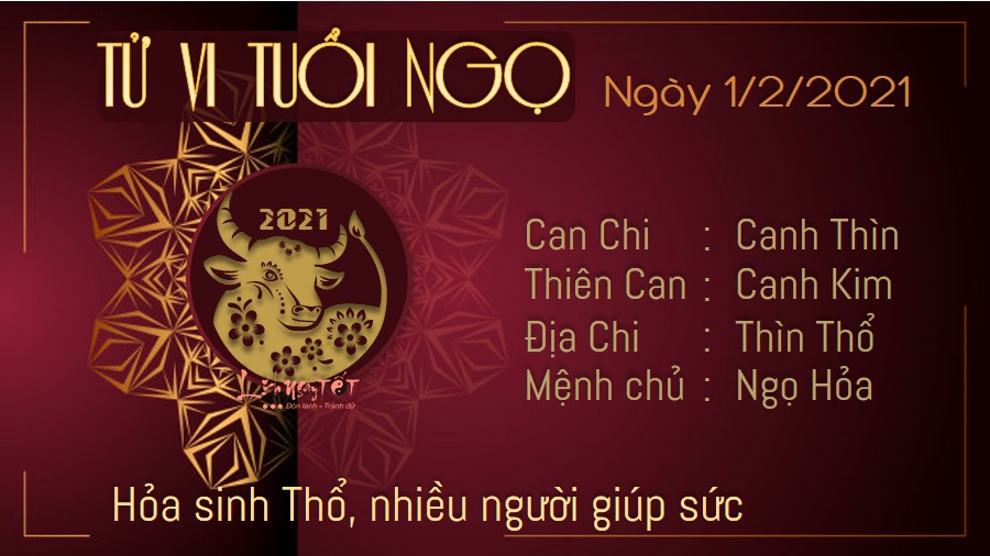 Hỏa sinh Thổ cho thấy người tuổi Ngọ đang xây dựng được những mối quan hệ xã giao tốt đẹp. Dù có gặp khó khăn đi nữa thì ngày hôm nay của bạn cũng không đáng lo, bởi xung quanh bạn luôn không thiếu người giúp đỡ. Trong gia đình, bản mệnh luôn quan tâm và nhường nhịn nửa kia, nhờ đó mà tình cảm vợ chồng được yên ấm. Đây là thời điểm thích hợp để hai người cùng lập những kế hoạch xa xôi và cụ thể hơn nữa trong tương lai. Hôm nay trực Bình là ngày tốt để tiến hành mọi việc quan trọng. Vì thế, nếu có kế hoạch gì muốn thực hiện trong ngày hôm nay thì bản mệnh nên bắt tay vào làm ngay để gặp nhiều may mắn.