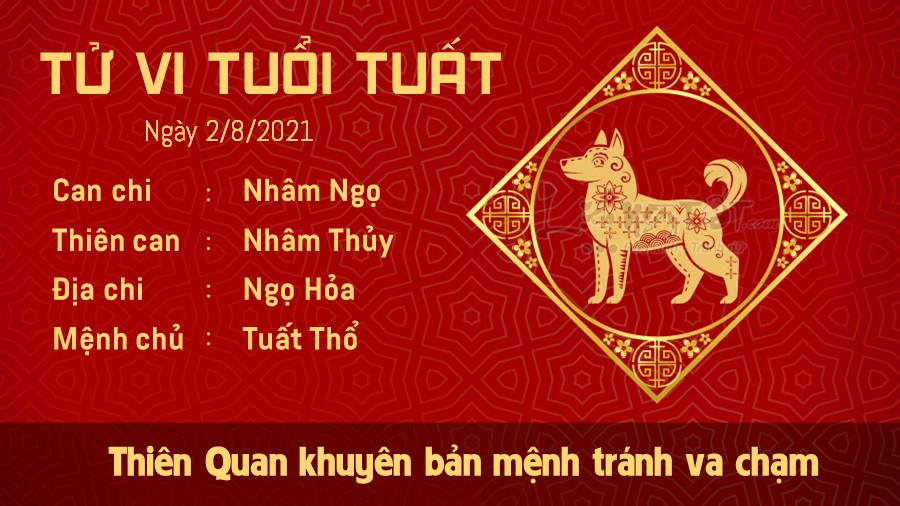 Thiên Quan khuyên người tuổi Tuất tốt nhất nên tránh va chạm với mọi người, đặc biệt là cấp trên hoặc những người có địa vị trong xã hội. Bạn có thể sẽ vướng phải nhiều rắc rối hơn nữa trong tương lai nếu không biết kiềm chế tính nóng nảy của mình. Nếu là lãnh đạo, bản mệnh cũng có thể trở thành một người độc đoán khi luôn muốn mọi người phải nghe theo sự sắp đặt của mình. Hỏa sinh Thổ cho thấy con giáp này có một mái nhà rất hạnh phúc. Nếu đã kết hôn, hai người luôn thấu hiểu và thông cảm với những hành động của đối phương mỗi khi nóng nảy. Nếu còn độc thân, bạn có cơ hội gặp được người khiến mình rung động, đôi bên có cơ hội phát triển xa hơn.