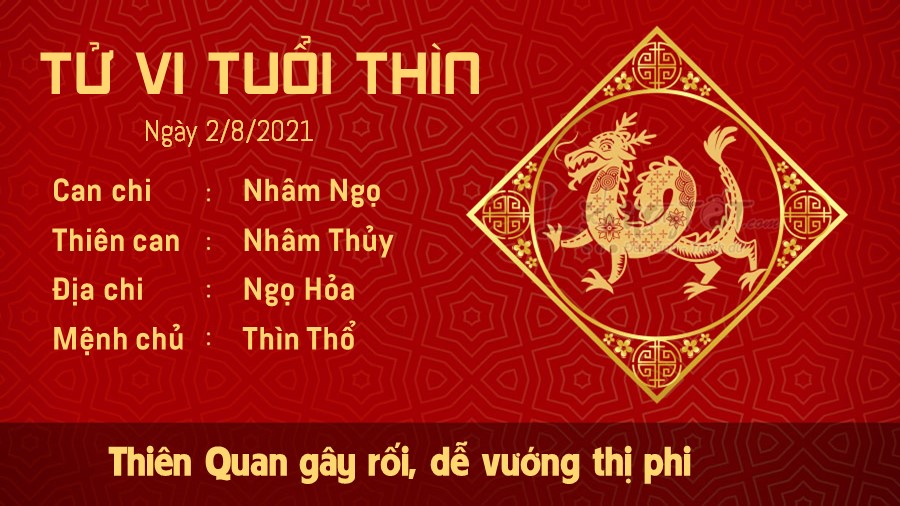 Thiên Quan gây rối, để tránh cho bản thân vướng vào những vụ tranh chấp, thị phi với kẻ tiểu nhân, tuổi Thìn cần phải kiềm chế bản tính nóng nảy, dễ bị kích động của mình. Đừng để việc này gây ảnh hưởng không tốt đến sự nghiệp của bạn, biến bạn thành con giáp khó thành công. Dù giữa bạn và lãnh đạo có quan điểm bất đồng, bạn cũng không nên đẩy mâu thuẫn lên quá cao, bởi có là người thắng hay thua trong cuộc tranh luận thì chưa chắc bạn đã nhận được lợi ích lớn lao gì. Hỏa sinh Thổ, mối quan hệ giữa con giáp này với những người lớn tuổi trong nhà rất hòa thuận. Người còn trẻ tuổi còn thiếu kinh nghiệm có thể tham khảo lời khuyên của người đi trước để tìm ra hướng đi đúng đắn cho mình.