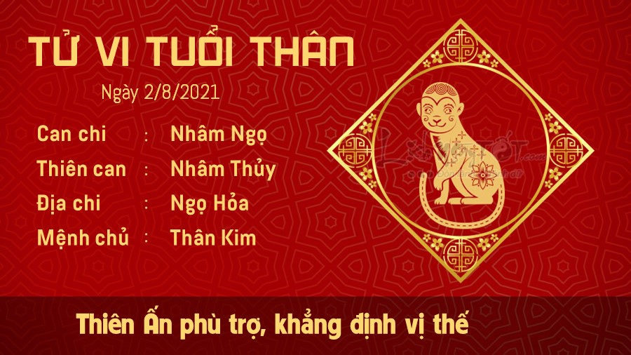 Thiên Ấn phù trợ, người tuổi Thân luôn nghiêm túc và chăm chỉ làm việc dần dần khẳng định được vị thế của mình. Dù trong hoàn cảnh khó khăn, bạn cũng vẫn là con giáp không ngừng cố gắng, vì thế, bạn luôn nhận được sự tôn trọng và ngưỡng mộ của đa số mọi người. Bạn có cơ hội thăng tiến trong tương lai. Bản mệnh là người tài giỏi song thường hay sống trong thế giới riêng, không muốn chủ động tiếp xúc với người khác. Đáng tiếc, Hỏa khắc Kim là dấu hiệu chứng tỏ mối quan hệ giữa mệnh chủ và nửa kia không quá tốt đẹp. Một vấn đề bất chợt nảy sinh khiến hai người đều cảm thấy buồn bực, khó thông cảm được cho đối phương. Hãy trò chuyện với nhau trước khi đưa ra những lời phán xét.